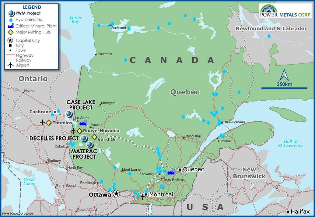 Figure 1 – Power Metals Corp Project Locations Map in Ontario and Quebec Canada