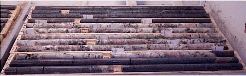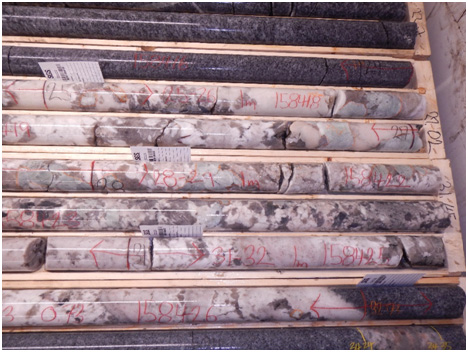 Figure 1 PWM-18-71, Boxes 5-8, 18.2-35.8 m. Note coarse-grained pale green spodumene inner intermediate zone in boxes 6 and 7.