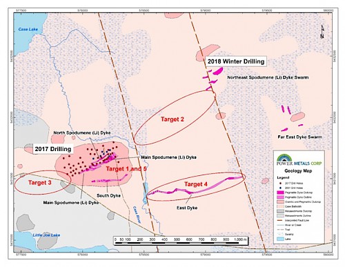 The proposed 8000 m drilling for the spring/early summer drill program will target the new spodumene pegmatite dykes located between the Main Dyke and the South Dyke (Figure 3 – Target 1). These new spodumene dykes were discovered at the end of the 2017 Main Dyke drill program (Power Metals press release dated Nov. 27, 2017). One of the new dykes was intersected in drill hole PWM-17-49 with 1.61 % Li2O and 143.8 ppm Ta over 3.0 m (Power Metals press release dated Jan. 24, 2018).