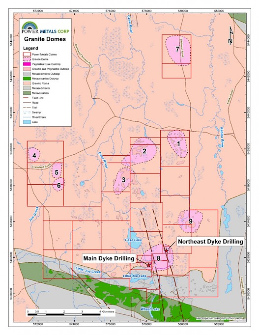 Power Metals identified that the Main, North, South, East and Northeast pegmatite dykes are not hosted by the Case Batholith as previously thought, but by a single laccolith (Power Metals press release dated Nov. 6, 2017). A laccolith is a dome-shaped igneous body with a flat bottom which is an offshoot of a batholith. A laccolith looks similar to a water drop on a table. The Case Batholith is a 50 x 85 km ovoid granitic complex characterized by a gravity low. Power Metals has identified that the Batholith has multiple domes along its margins.