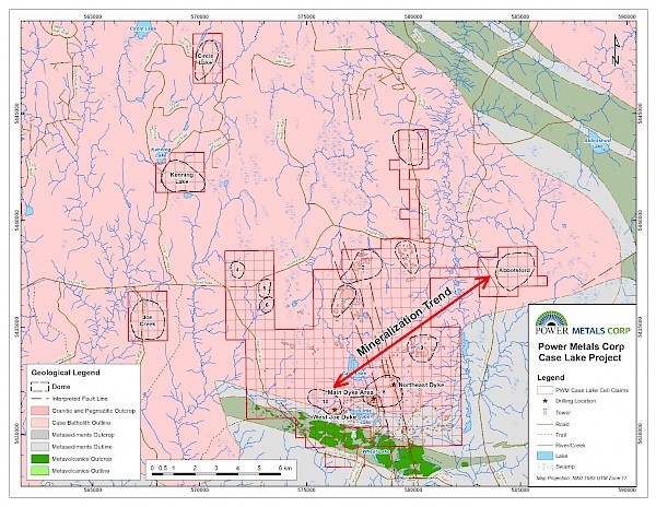 The Joe Creek dome is located west of the Case Lake Property, and Kenning Lake and Circle Lake domes are located northwest of the Case Lake Property. The staking of these three domes is part of Power Metals regional exploration plan. All three domes have excellent road access which include logging trails. All three domes have abundant outcrop and are topographic highs.