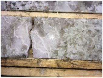 Figure 1 Pale pink to grey pollucite with white veining next to pale green spodumene at 49.5 m, PWM-18-116, West Joe Dyke